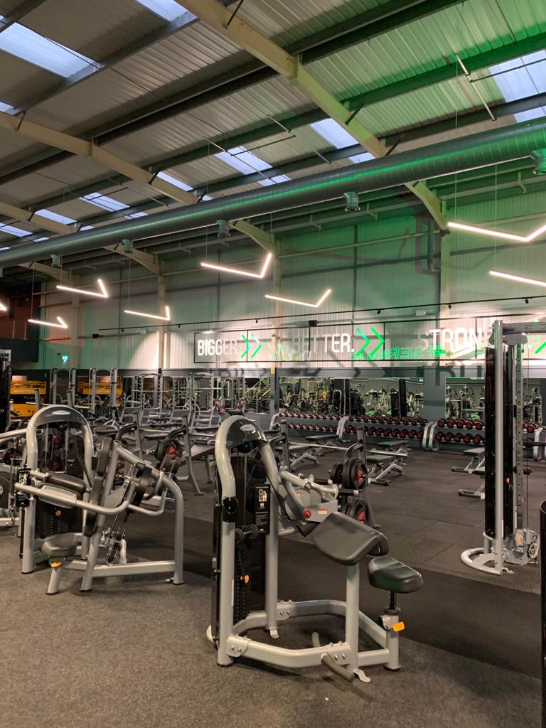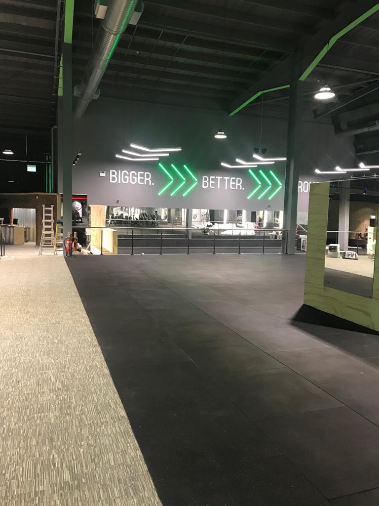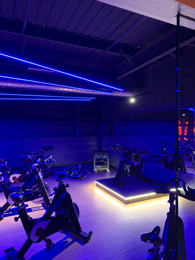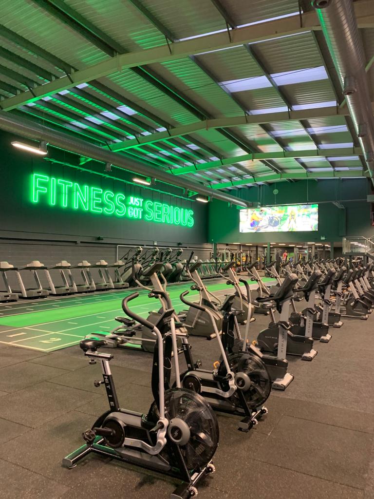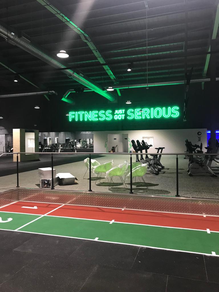 Neon signage and  equipment spotlighting across the gym floor and walls to give the gym a real 21st century look and feel.