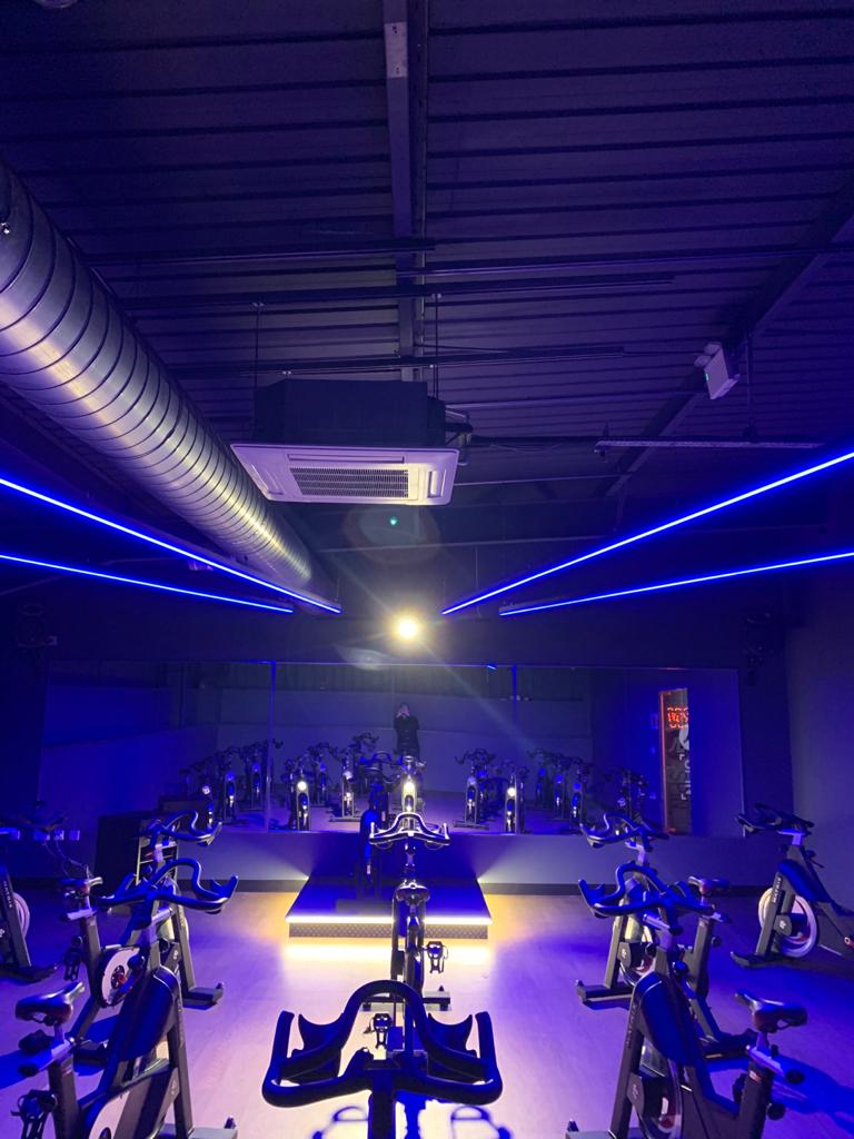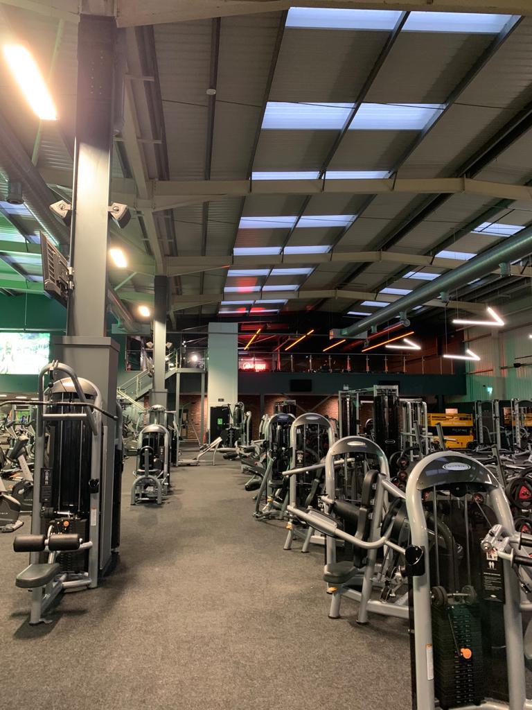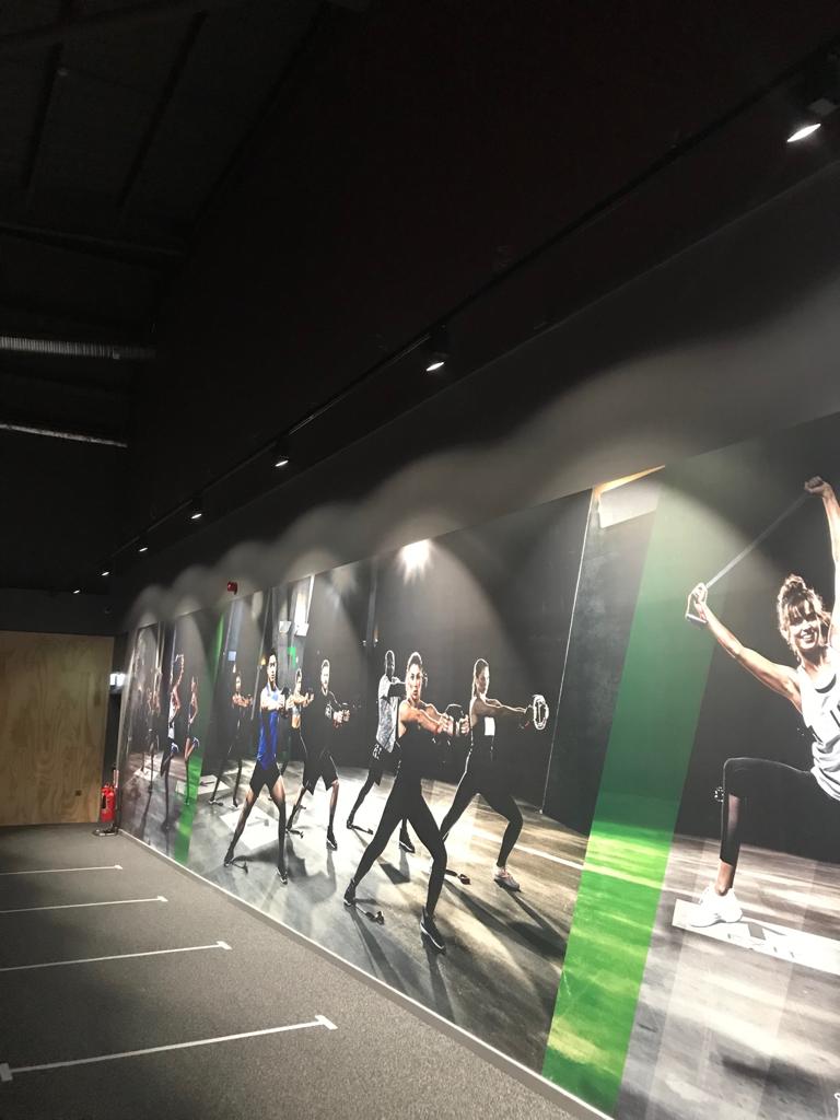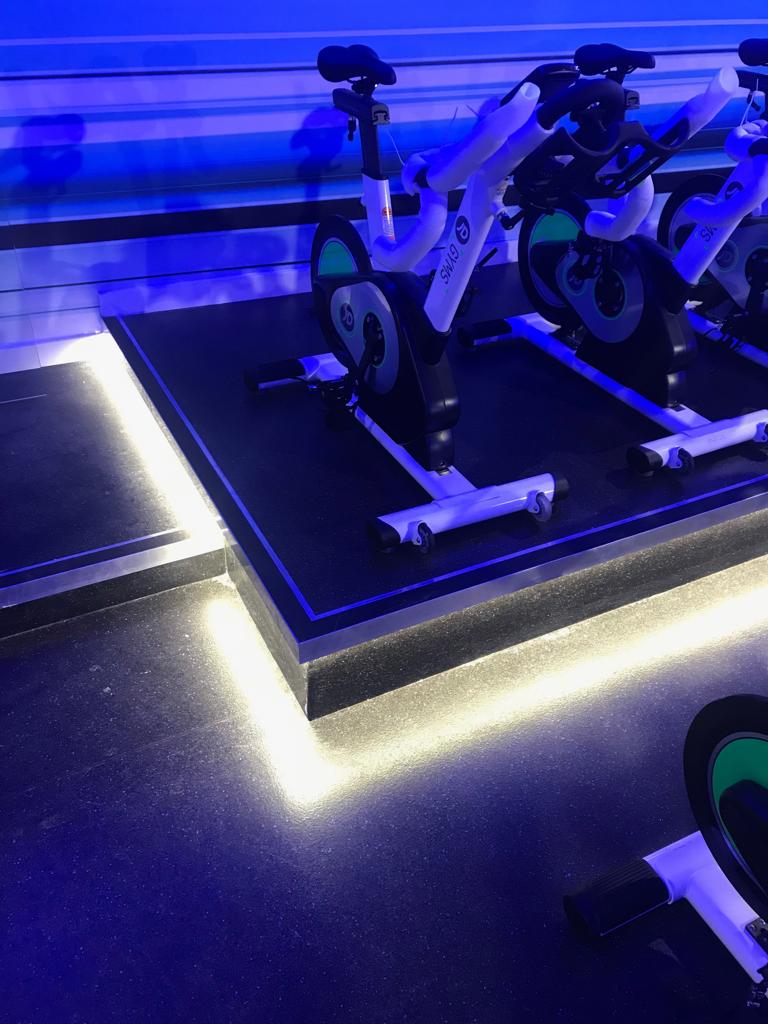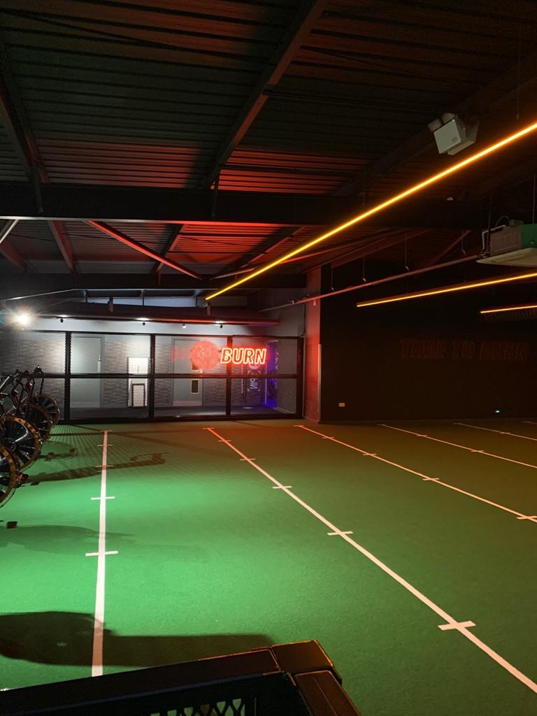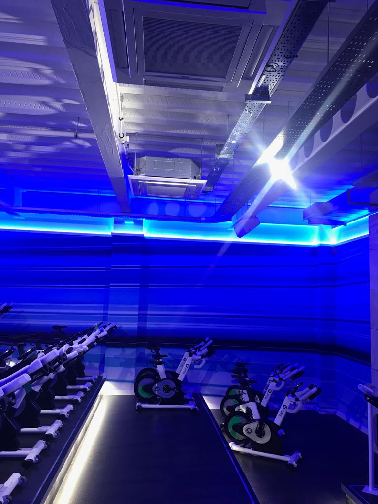 Neon signage and  equipment spotlighting across the gym floor and walls to give the gym a real 21st century look and feel.