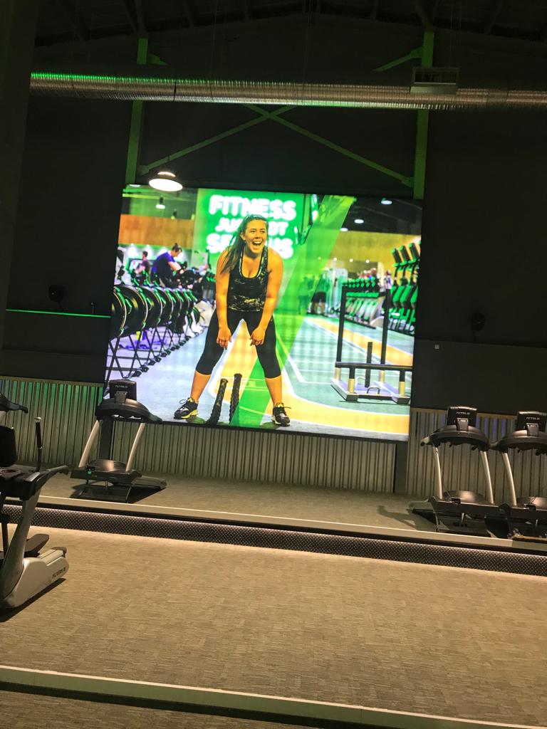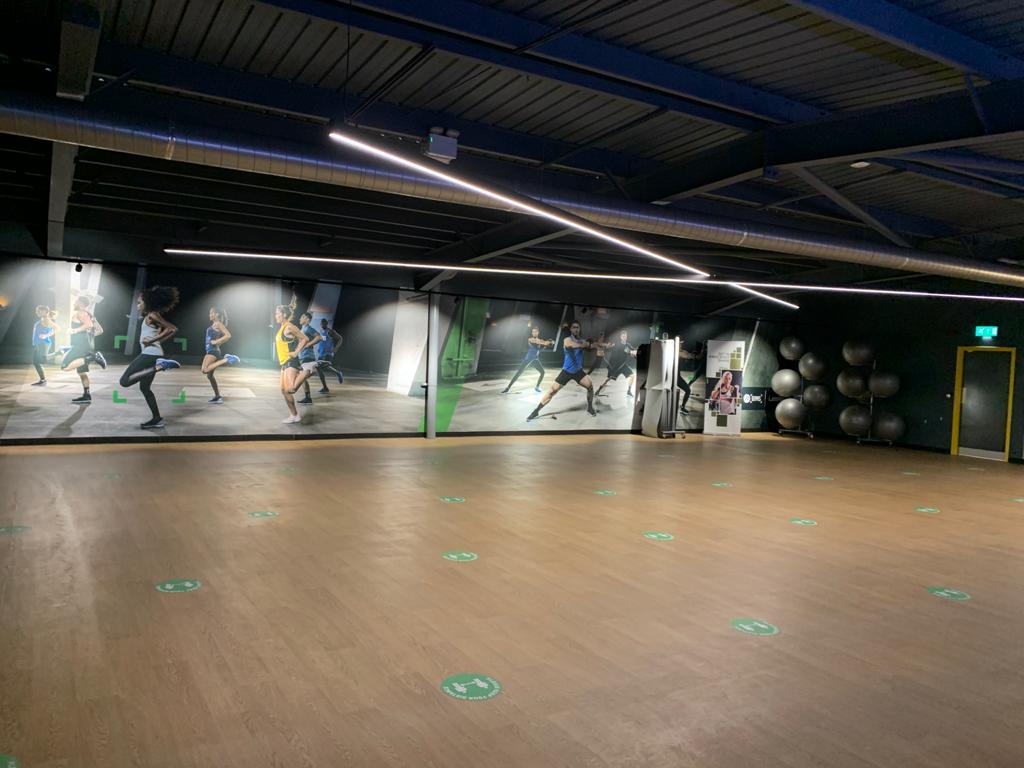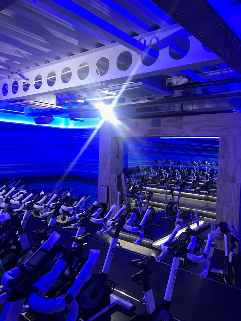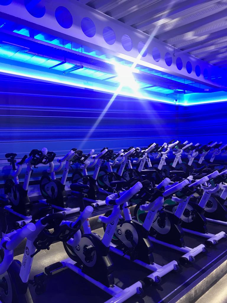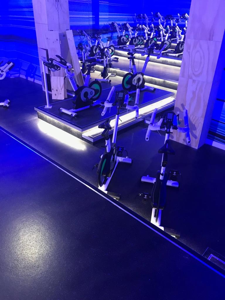 Neon signage and  equipment spotlighting across the gym floor and walls to give the gym a real 21st century look and feel.